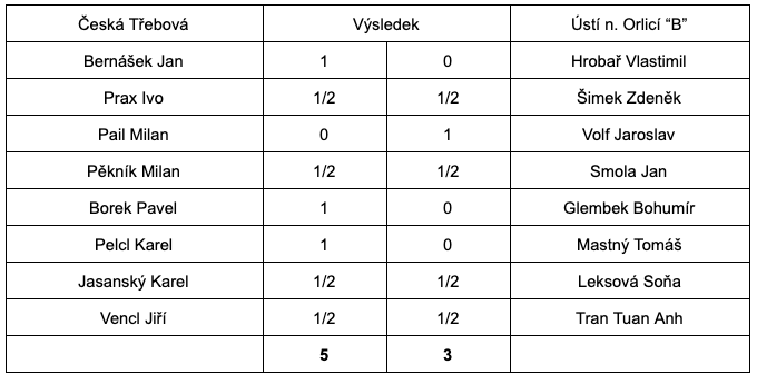 Jak to nakonec dopadlo? Podařilo se nám nakonec uplatnit drobnou ratingovou převahu a zvítězit v poměru 5 – 3. Zápas skončil až krátce po 14 hodině, tedy asi po 4 hodinách hry.