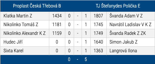 Postupně se veliká ratingová převaha projevila a hosté vyhráli v poměru 5-0, ačkoliv některé partie vypadaly slibně. Za českotřebovský oddíl poprvé nastoupil náš junior Karel Sixta, který měl na 5. šachovnici svoji premiéru. Karel rozehrál partii moc pěkně, ale postupně se projevila převaha soupeřky. Máme ale pěknou partii na rozbor na kroužek. Z celkového počtu 5 hráčů za nás nastupili 2 junioři (Tomáš Nikolínko a Karel Sixta), a to nás těší.
