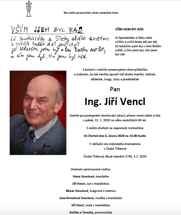 Výňatek ze smuteční řeči: „Esperantisté, kteří v příštím roce připravují v České republice celosvětový kongres, by mohli dlouze vyprávět třeba o esperantských Silvestrech, kde pozvedl už tak dobrou náladu. Českotřebovský zpravodaj zase Jirku zmiňuje jako zakládajícího člena své redakční rady. Šachisté si Jirku nepřipomínají jen tím, že zatím poslední dvě vážné partie s Milanem Pěknikem (Milan tady možná je) a Martinem Buchtou z Poličky prohrál, ale i úspěšné výsledky na nedávném vánočním klubovém turnaji, na turnaji v Ústí nad Orlicí, v Sendražicích, v Mistrovicích, a to nehovořím o hraní šachů na internetu, kde naposledy hrál ve čtvrtek 30. 1. 2020, tedy den před svou smrtí a tuto partii vyhrál, bohužel jen v šachu. Jirka také mnoho let předsedal šachovému oddílu a měl rozhodcovské zkoušky. Pravidelně ve středu chodil na Zpívánky do Klubu nevidomých a slabozrakých. Pravidelně v neděli samozřejmě v neděli 26. 1. nevyjímaje pak docházel do modlitebny Církve Československé husitské, ale o tom bude hovořit člověk povolanější.“