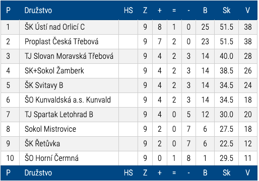 Nakonec vítězíme 5.5 – 2.5. V tabulce obsazujeme 2. místo (Ústí „C“ porazilo Moravskou Třebovou 6.5 – 1.5). Pokud Ústí nebude chtít postoupit, a zatím to tak vypadá, mohla by si Česká Třebová po letech zahrát vyšší soutěž – KP1.