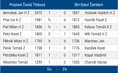 V posledním kole KPII jsme doma přivítali tým Žamberka. Po osmém kole okupoval tým soupeře čtvrtou příčku. Když se podíváte na jejich základní sestavu, jsou to velmi kvalitní hráči. Nám se ovšem podařilo nastoupit ve velmi silné sestavě a tudíž jsme v zápase byli mírnými favority.
