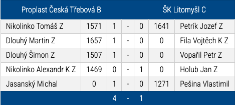Celkově tedy výhra 4 – 1. V tabulce to na umístění našeho týmu nemělo vliv. Hlavní pozitivum ale je, že nastoupili 4 mladí a zaznamenali 4 body. To je určitě příslib pro další výkony.