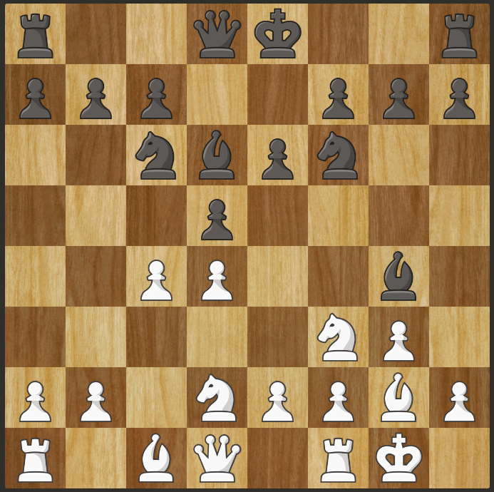 V této pozici je za černého nejlepší udělat rošádu. Ostatně takto se to učí i mládež. Vývin figur, obsazení středu a rošáda. První 2 zásady černý splnil a měl i tu třetí. V partii se stalo ambiciózní 7. … e5 (?), čímž se černý pouští do šarvátek s králem v centru.