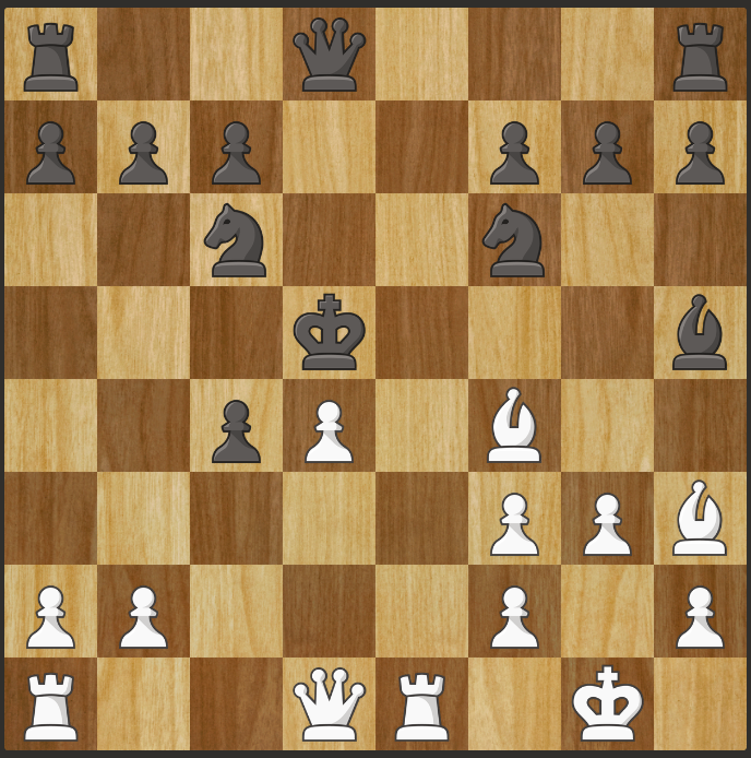 A bílý se toho nebojí a do útoku investuje další materiál. 13. Jc4+ !! (podle počítače šlo i chladnokrevné Da4, ale toto prokračování je mnohem lidštější, protože jde přímo po králi. 13. … dxc4 14. Sf4+ Kd5 (šlo i Je5, ale to dává figuru a král je stále v centru).