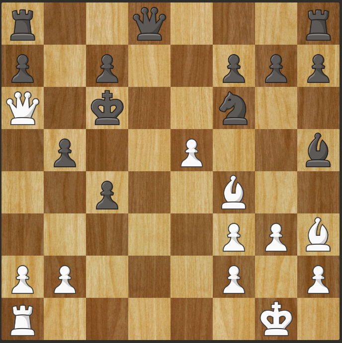 Počítač zde zase říká Da4. Ale Robert zahrál 15. Ve5+ (!) Jxe5 16. dxe5+ Kc6. Zajímavá je situace, jak by bílý pokračoval po 16. … Kc5. Zkuste si to propočítat na šachovnici. 17. Da4+ b5 18. Da6+